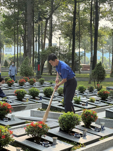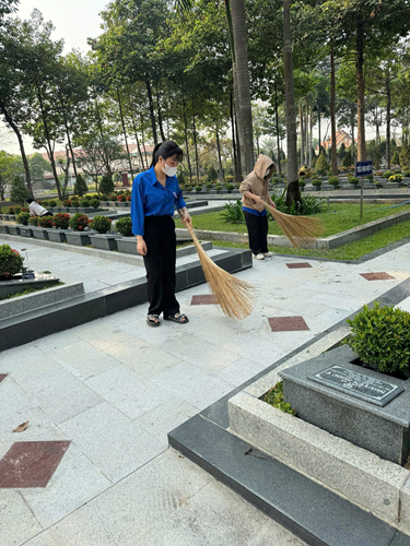 Bên cạnh nghi thức dâng hương, các đoàn viên còn chung tay quét dọn, chăm sóc cảnh quan, góp phần giữ gìn sự tôn nghiêm và sạch đẹp cho nơi yên nghỉ của các anh hùng.